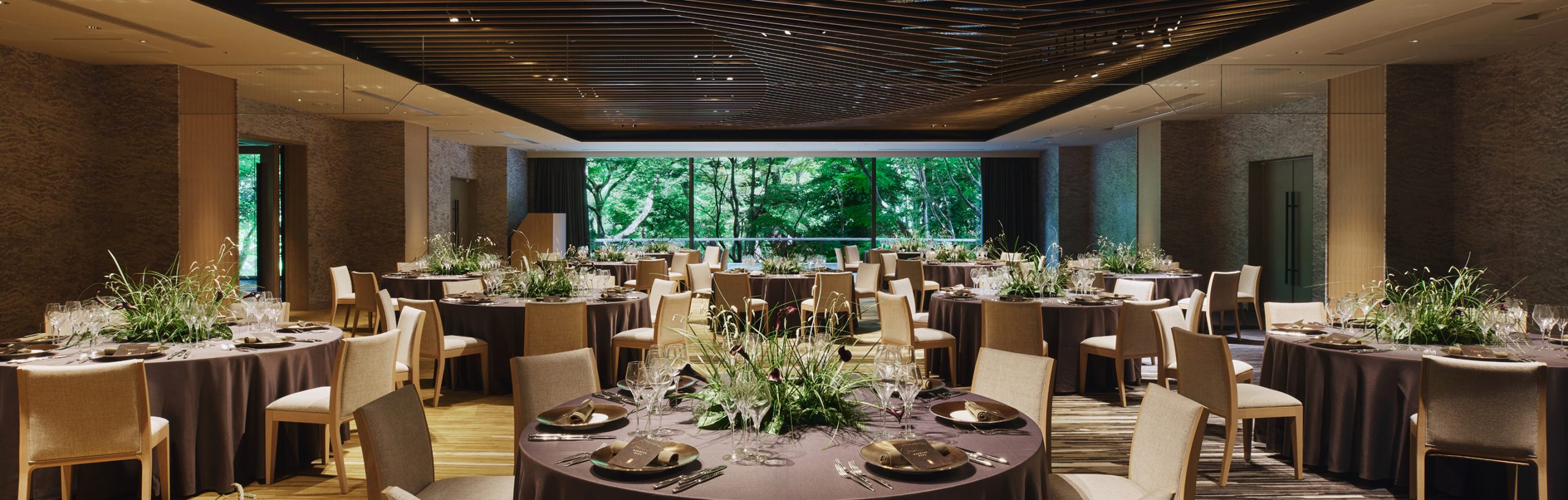 窓一面に日本庭園を望み、四季の美しい季節の移ろいを感じるバンケット。天井の奥や、壁に仄かな光が反射し、水面に映る月の情景を描いています。