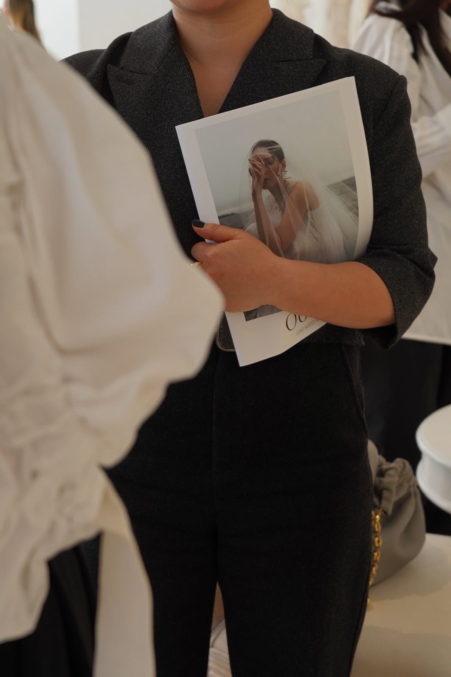 日本では、成人を迎えると親から子へ振袖を贈ったり、結婚の際には1から仕立てた着物を贈ったりと大切なわが子へ節目の品を送る文化や風習があります。 KOTOHOGIも「こころを纏う」というフィロソフィーがあるように、インポートドレスも丁寧に愛を持って作られたものを扱いたいと思っています。 だからこそ、買い付けの際にはデザインを見るだけではなく、直接デザイナーと会話をし、ドレスへの愛情が感じられるか、そのドレスが大切に作られたものかどうかも見極め買い付けをしています。 ドレスに触れる手や、説明をするその表情から、ドレスを大切に想う気持ちがくみ取れた時に初めて、八芳園のお客様にお届けしたいと心から確信を持つことができるのです。