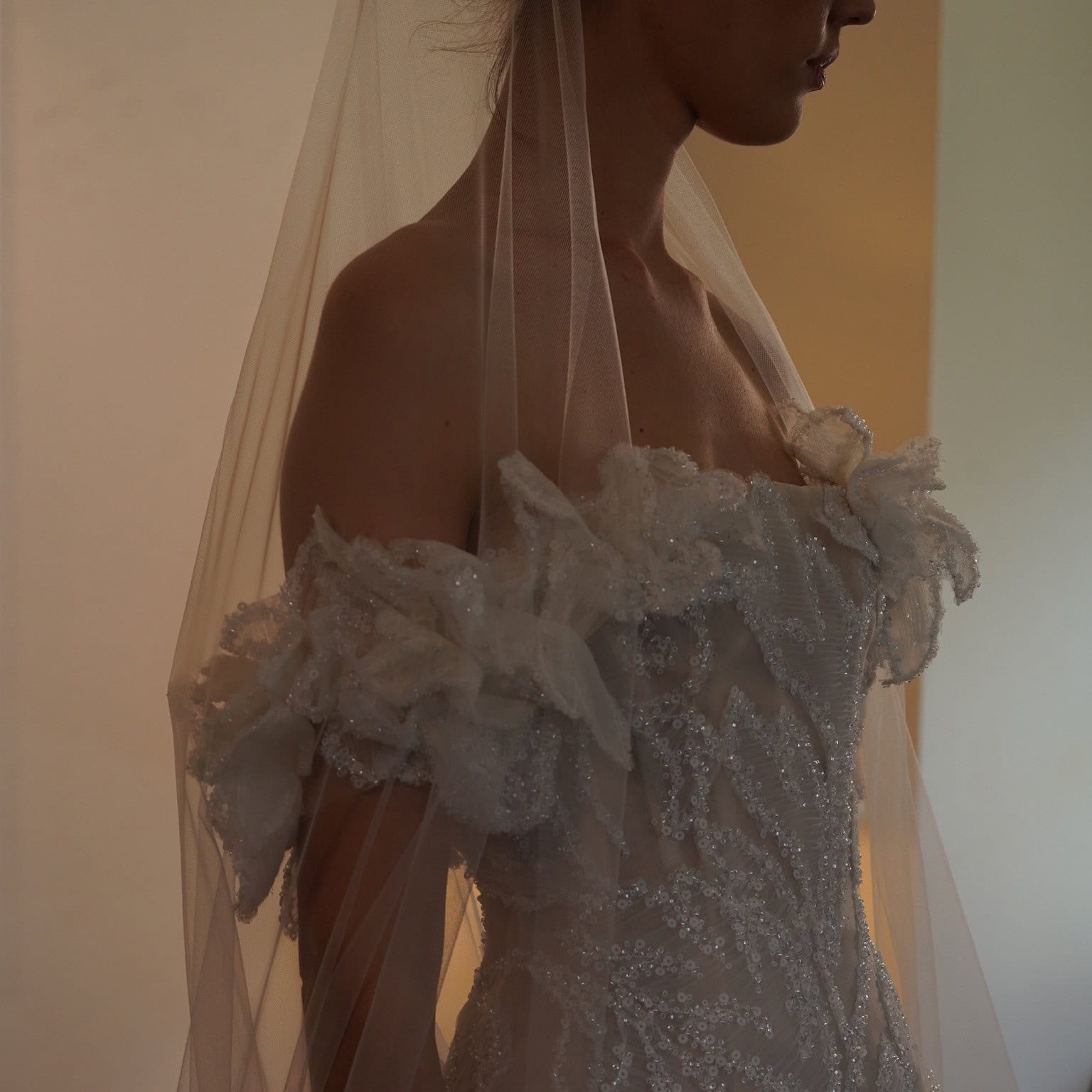 例えば、レース刺繍は華やかすぎるものではなく、シンプルで上品なものを選んだり、色合いにおいては、真っ白ではなく黄なりで奥行きのある生地を採用したりしています。 ビーディングにおいても、クリアで透明感のあるものが使用されているかも重要な要素となります。 華美にはなりすぎず、上品さがより際立つよう素材にもこだわって選んでいます。
