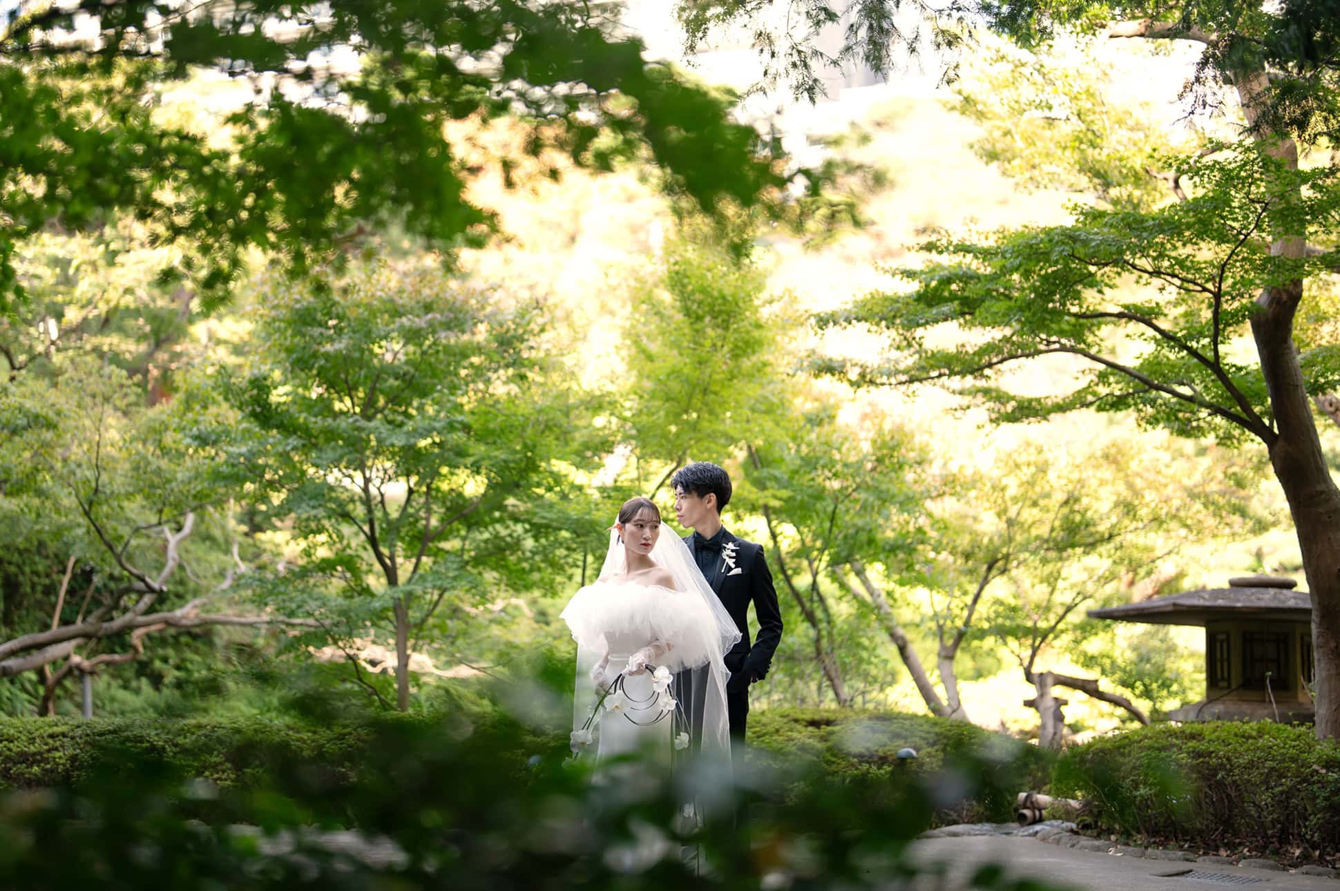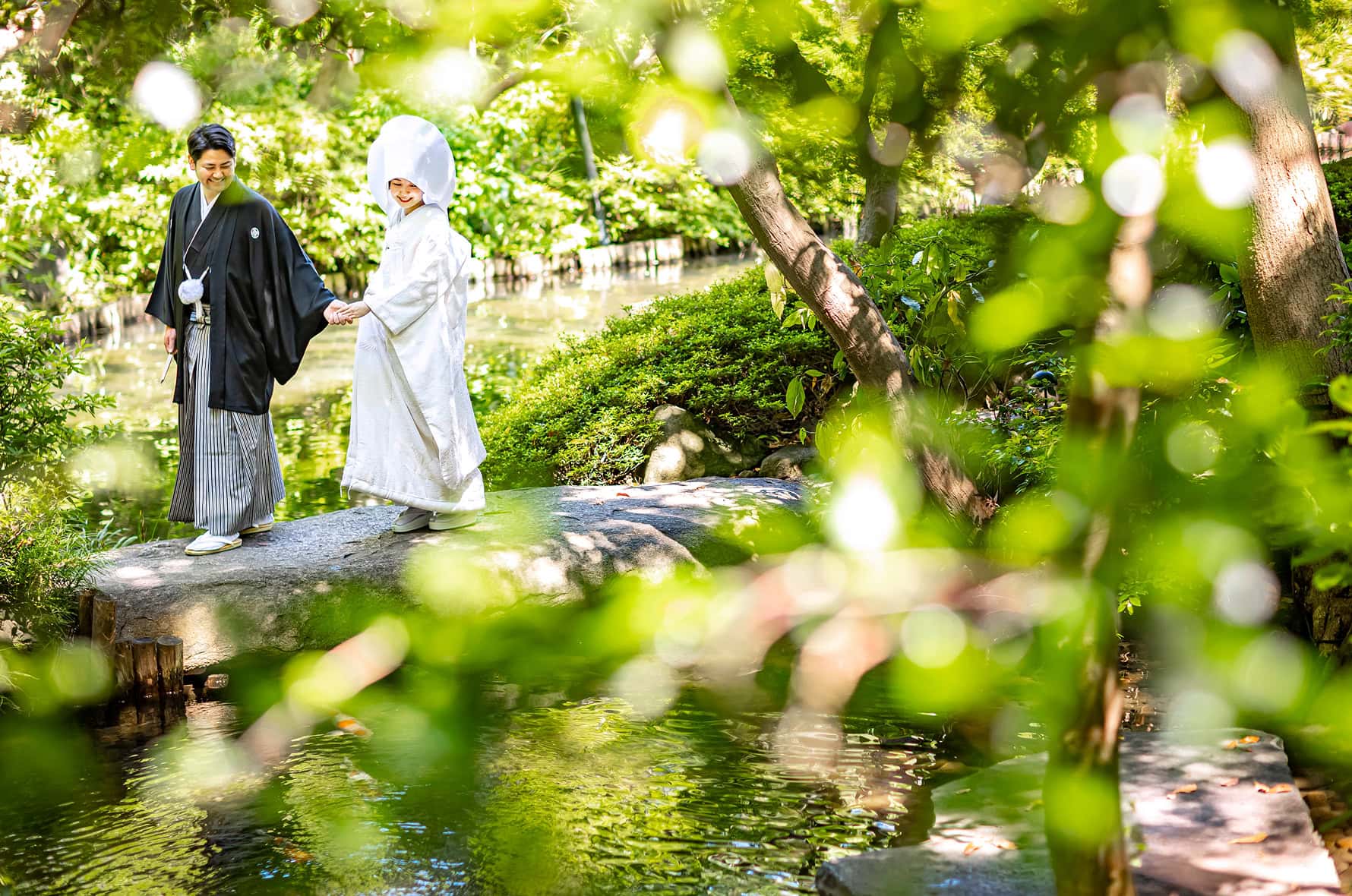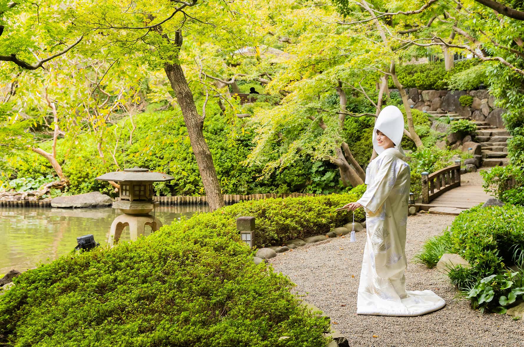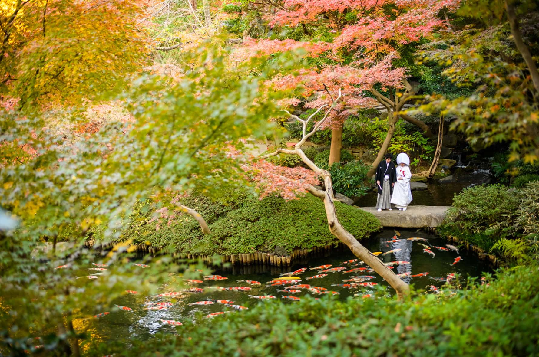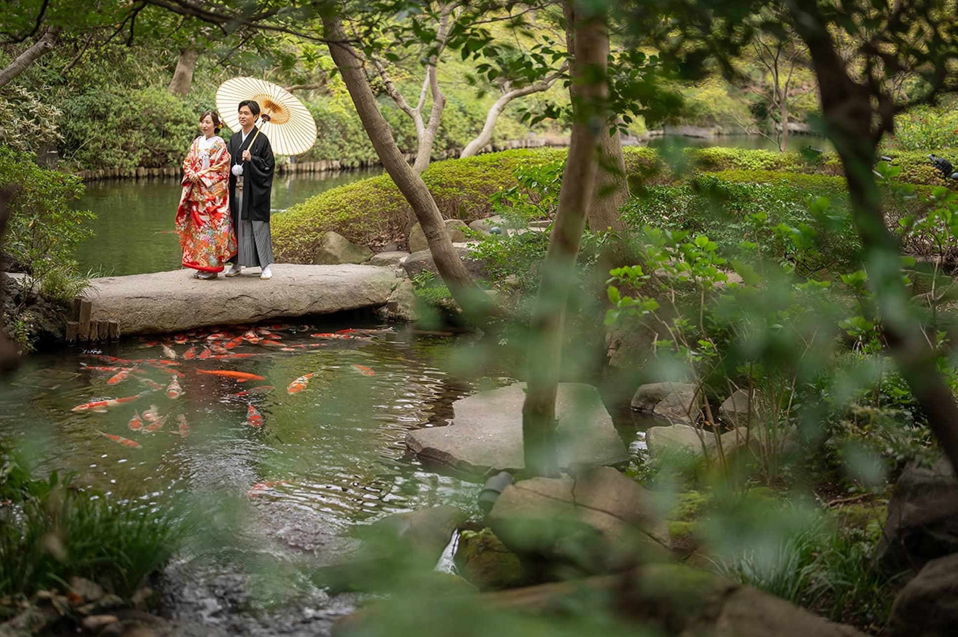 舞台は、約一万坪の敷地内に広がる広大な日本庭園。約400年の歴史を持つ庭園は、四季折々の美しい表情を見せます。庭園内の様々なスポットだけでなく、チャペルや神殿など園内には数多くのロケーションが。衣裳やおふたりのイメージに合わせて、バリエーション豊かな写真を残していただくことができます。