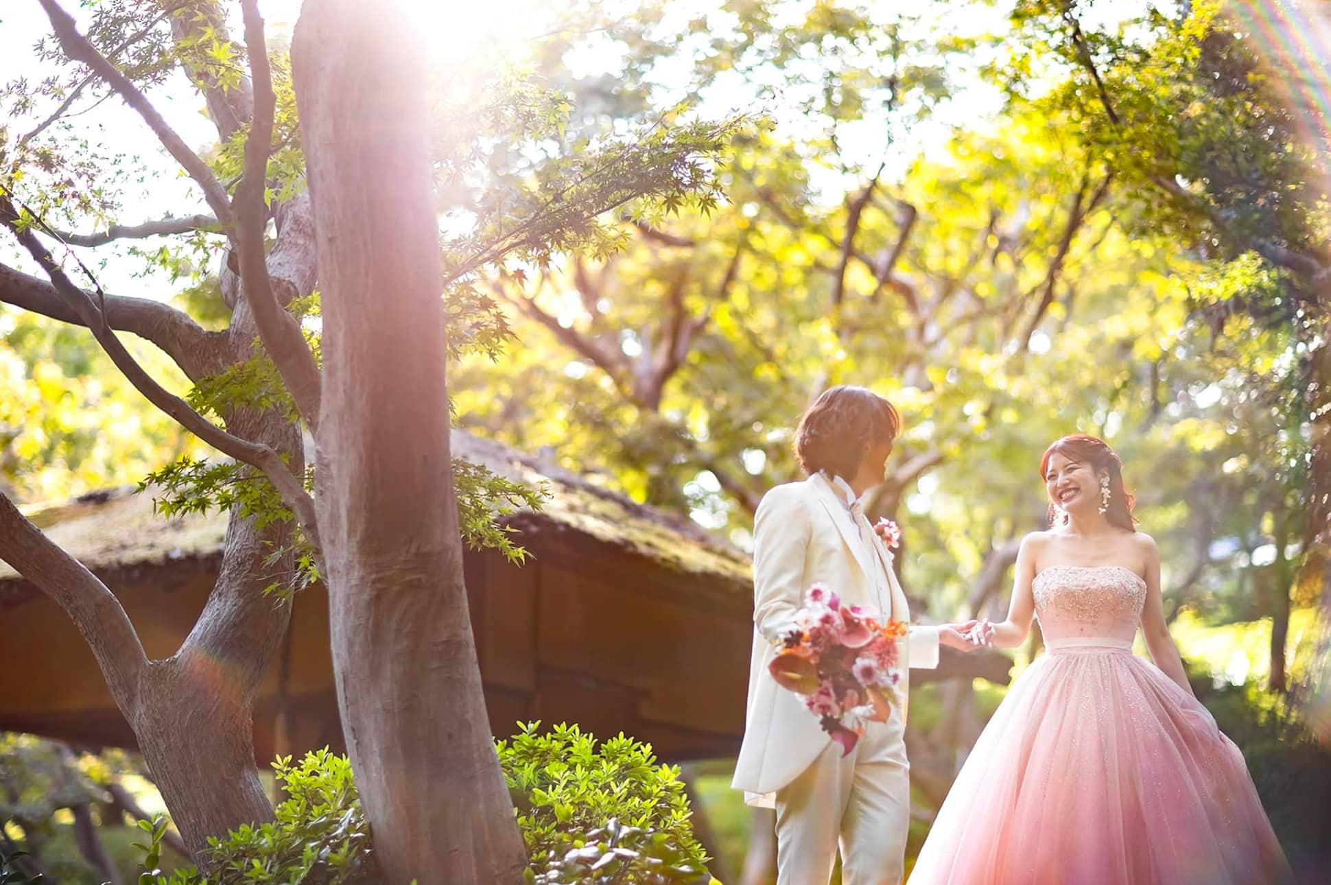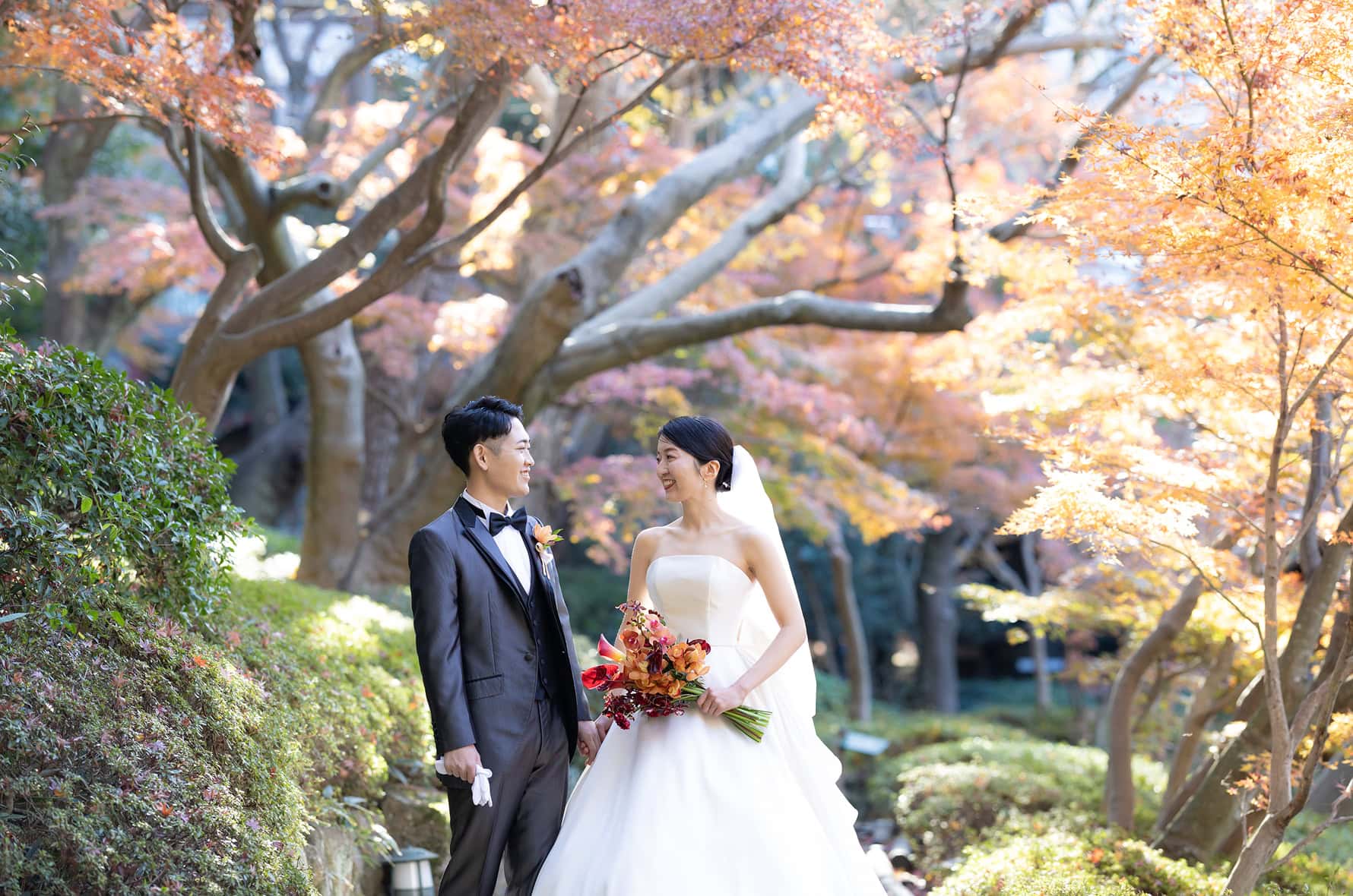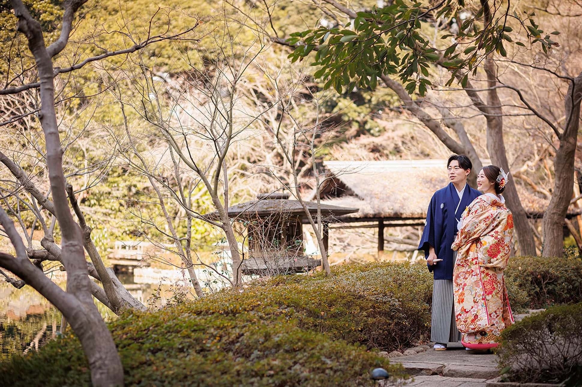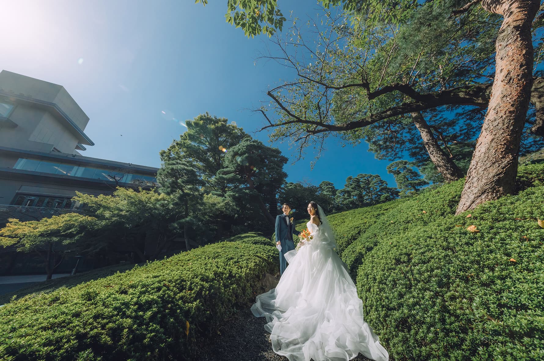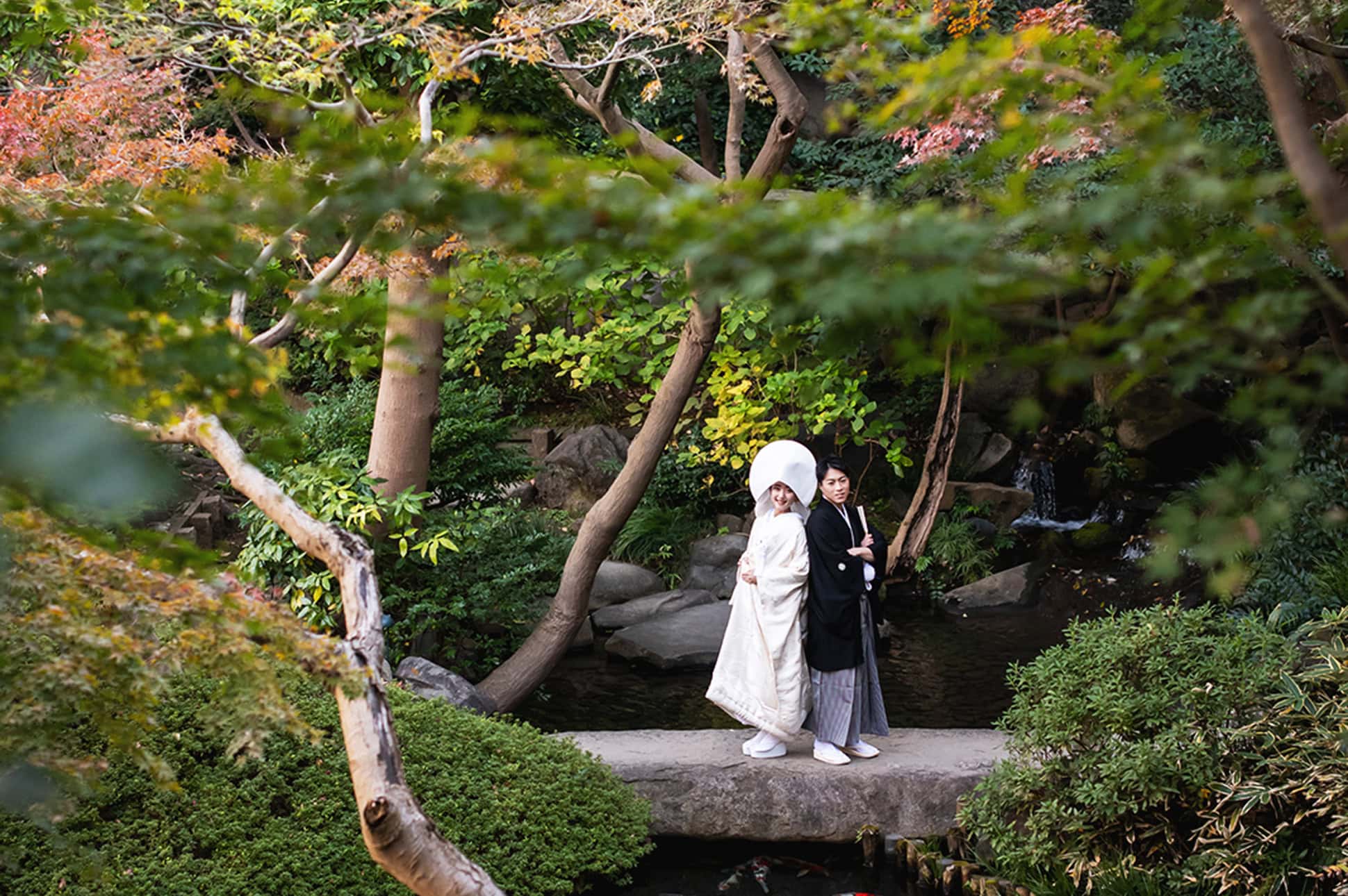 舞台は、約一万坪の敷地内に広がる広大な日本庭園。約400年の歴史を持つ庭園は、四季折々の美しい表情を見せます。庭園内の様々なスポットだけでなく、チャペルや神殿など園内には数多くのロケーションが。衣裳やおふたりのイメージに合わせて、バリエーション豊かな写真を残していただくことができます。