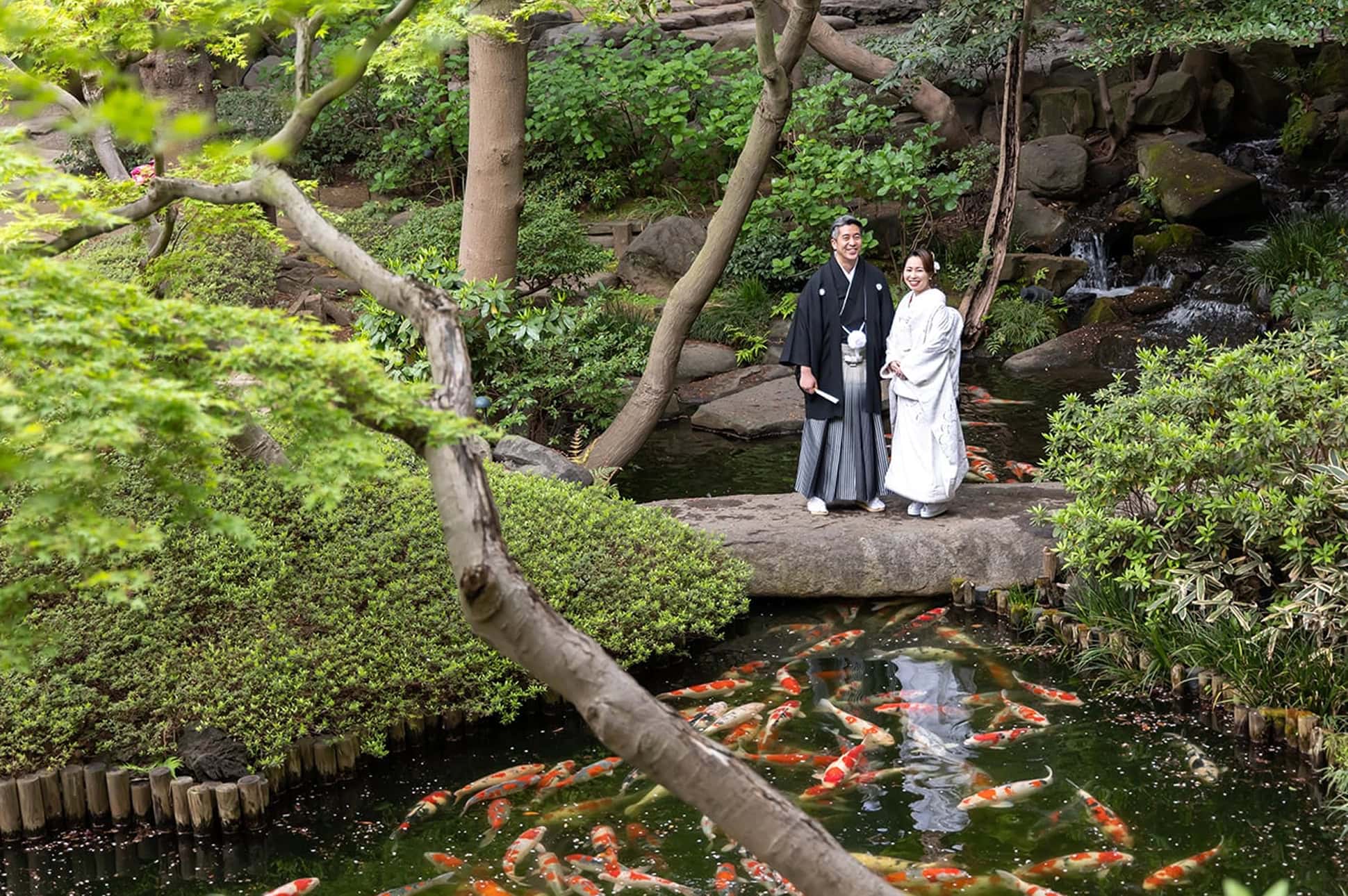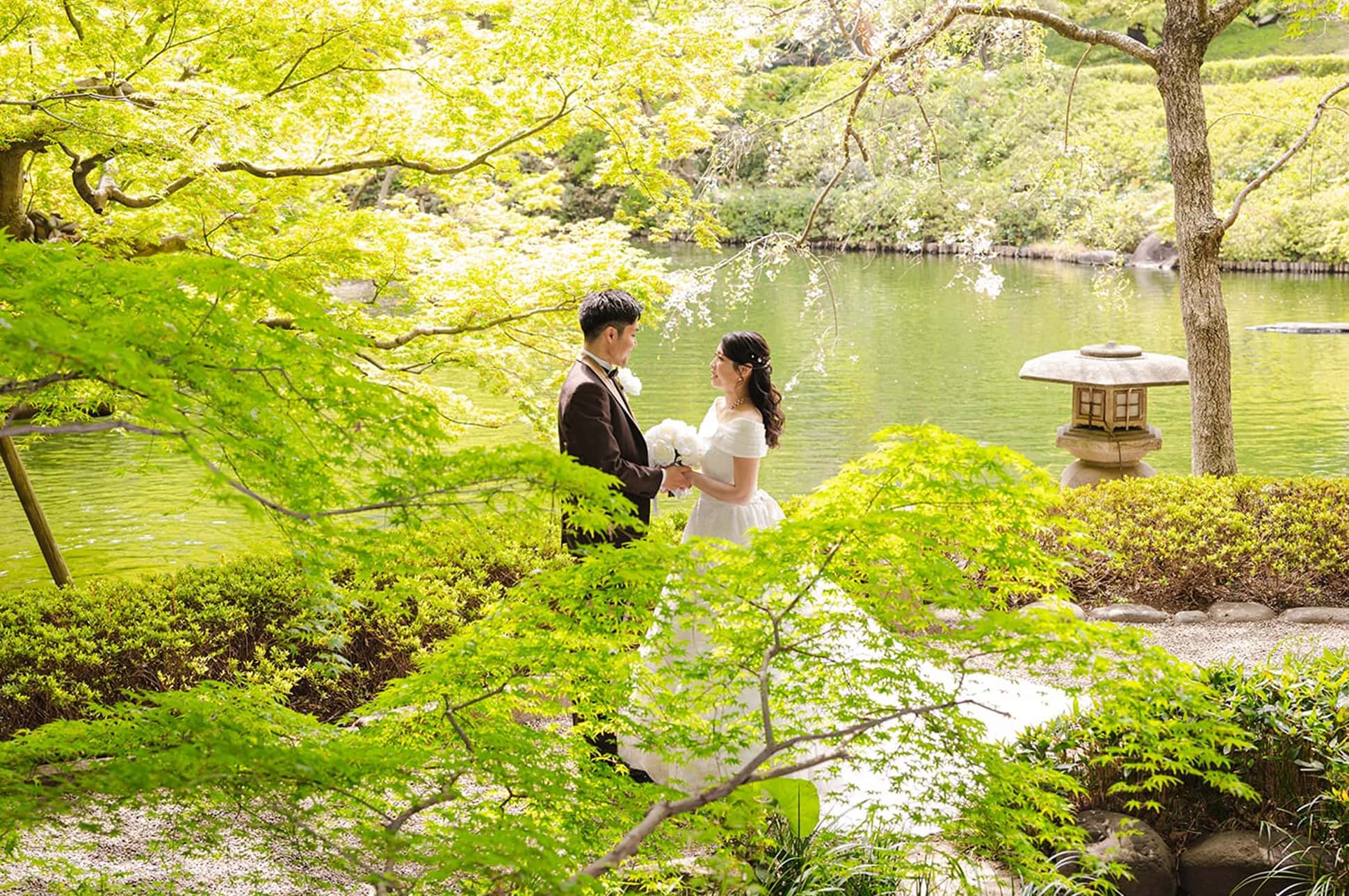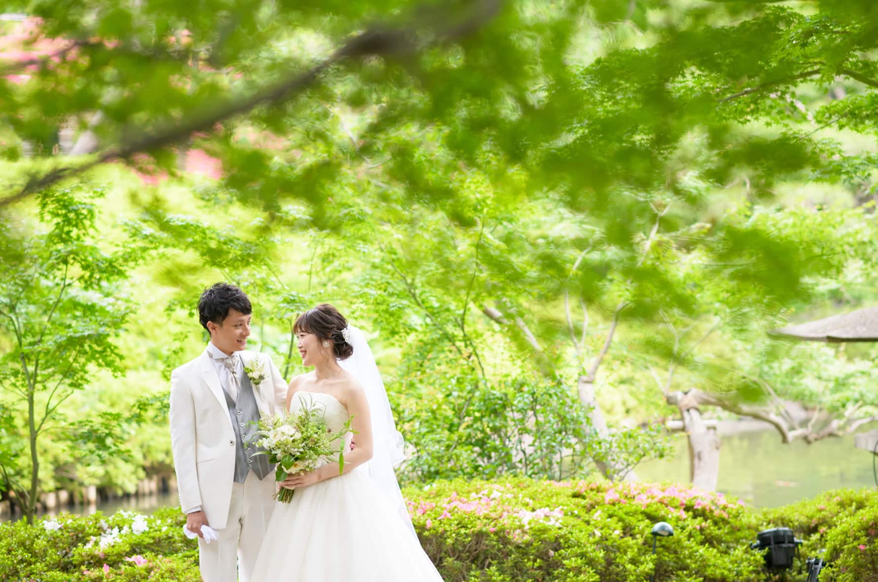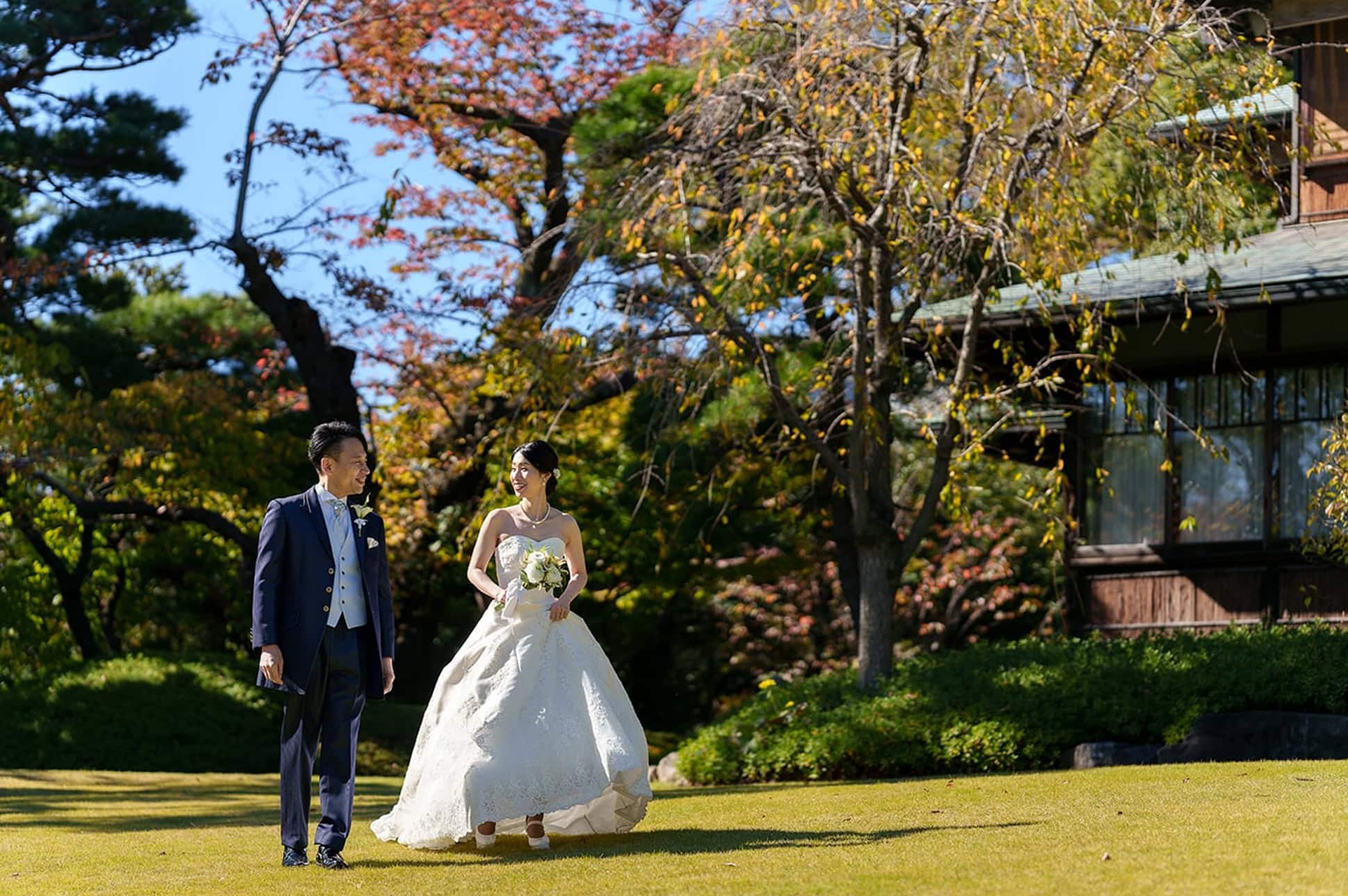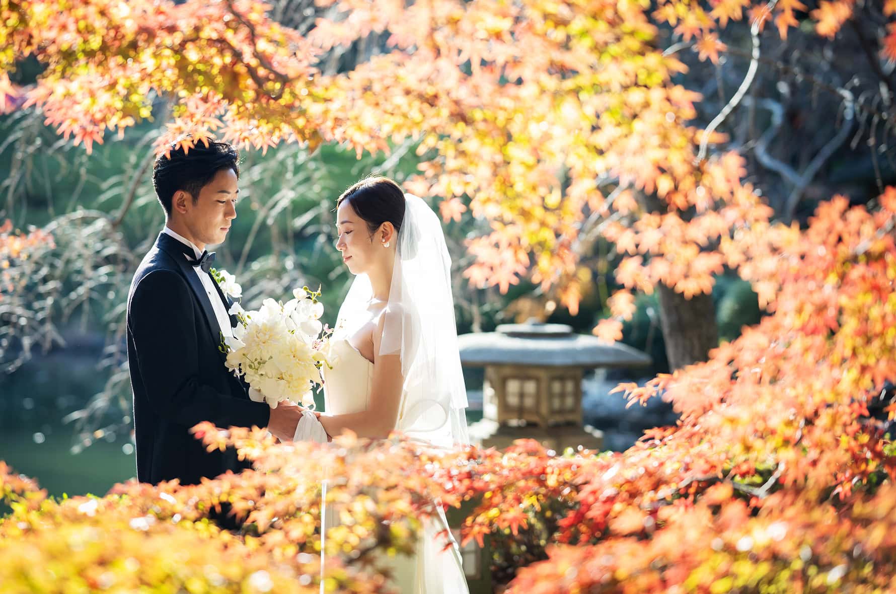 舞台は、約一万坪の敷地内に広がる広大な日本庭園。約400年の歴史を持つ庭園は、四季折々の美しい表情を見せます。庭園内の様々なスポットだけでなく、チャペルや神殿など園内には数多くのロケーションが。衣裳やおふたりのイメージに合わせて、バリエーション豊かな写真を残していただくことができます。