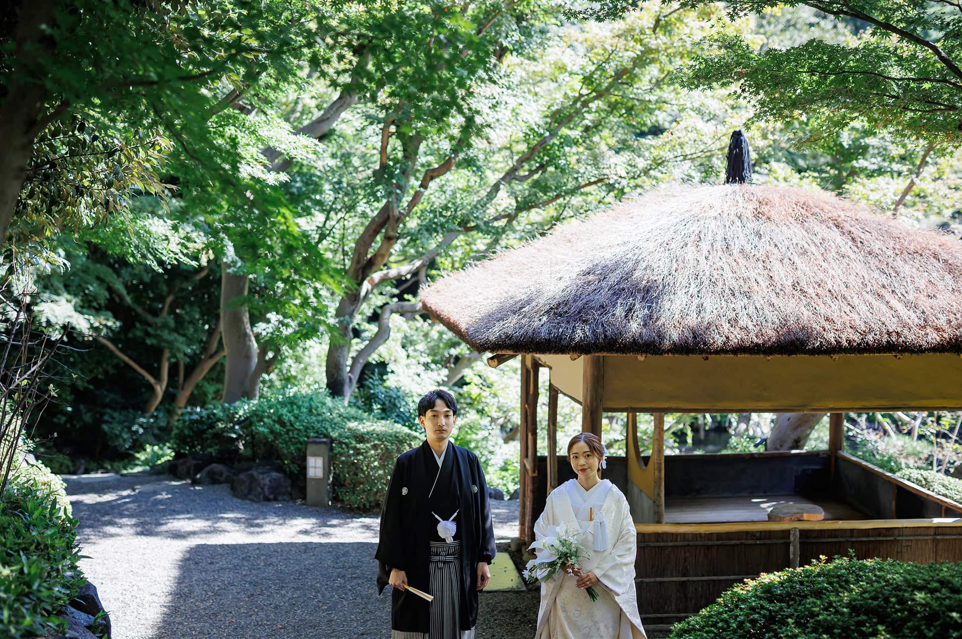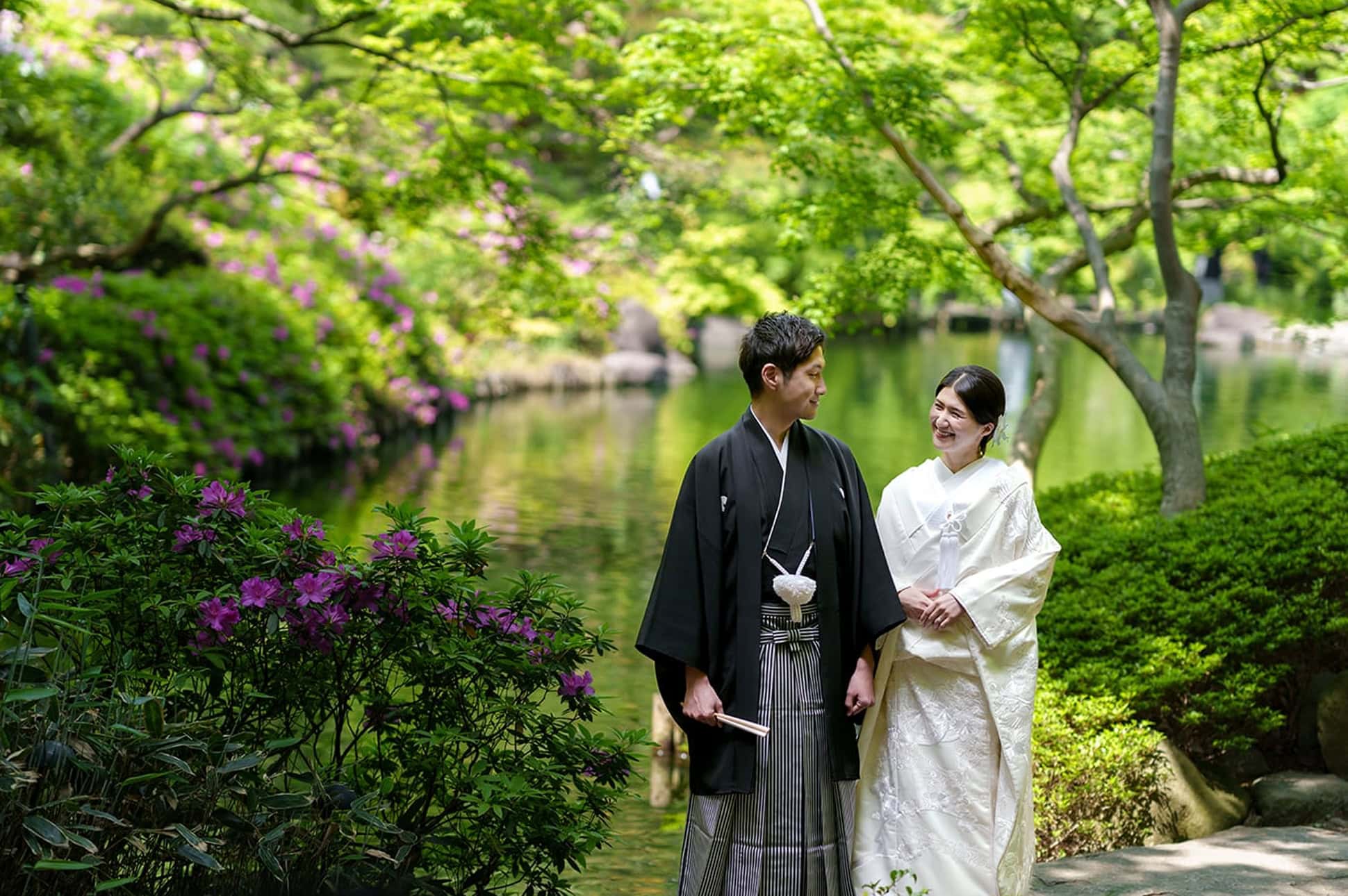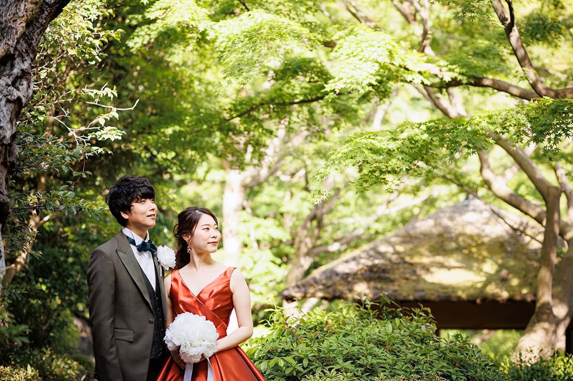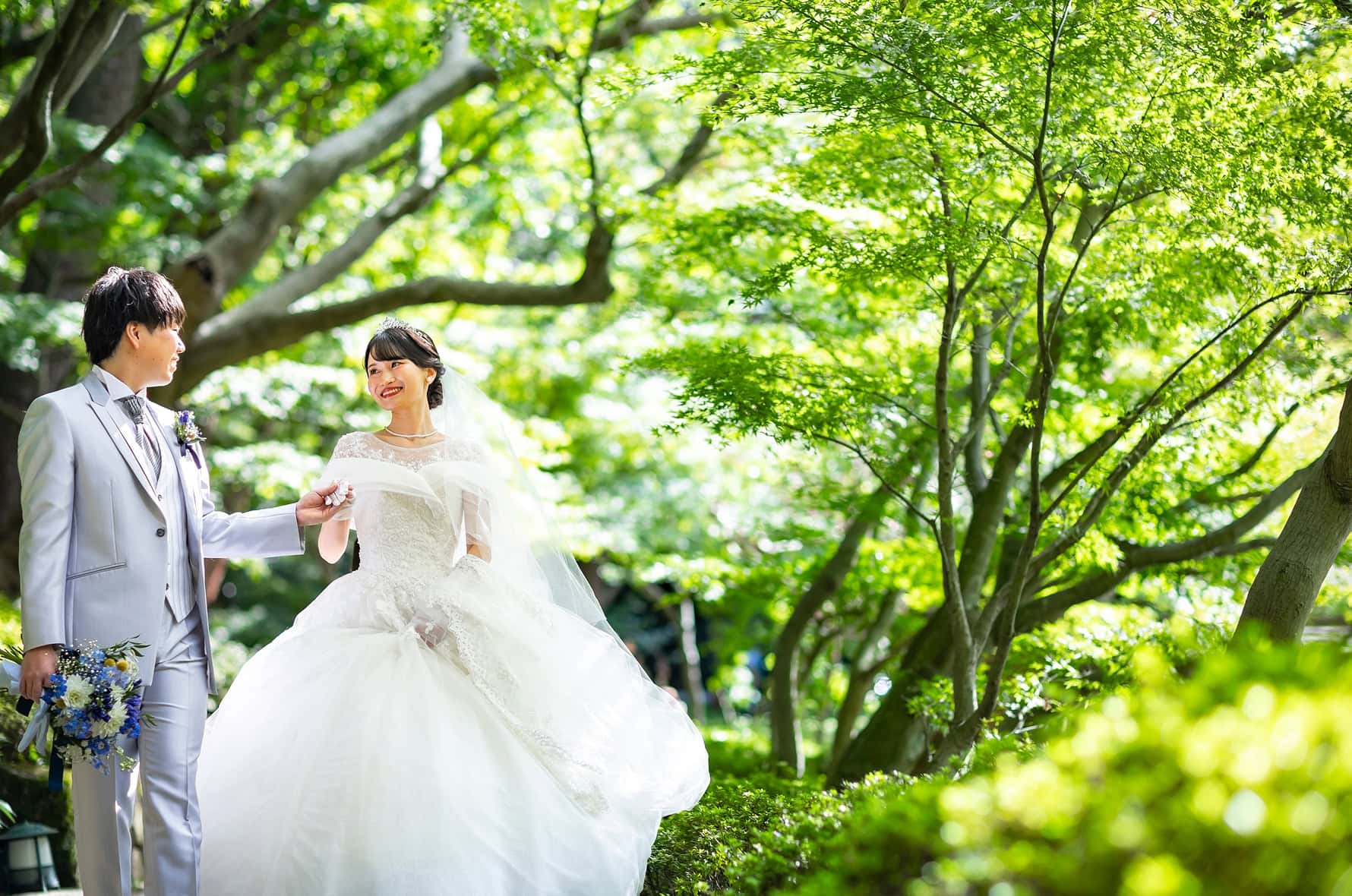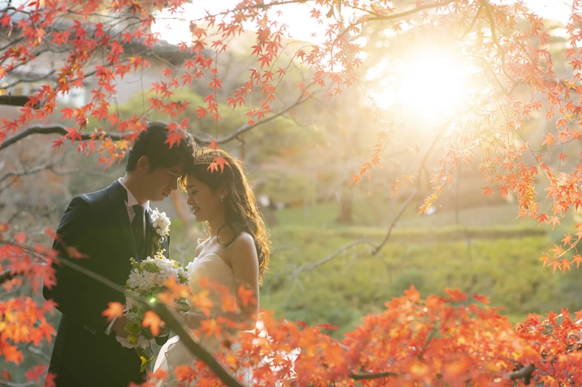 舞台は、約一万坪の敷地内に広がる広大な日本庭園。約400年の歴史を持つ庭園は、四季折々の美しい表情を見せます。庭園内の様々なスポットだけでなく、チャペルや神殿など園内には数多くのロケーションが。衣裳やおふたりのイメージに合わせて、バリエーション豊かな写真を残していただくことができます。