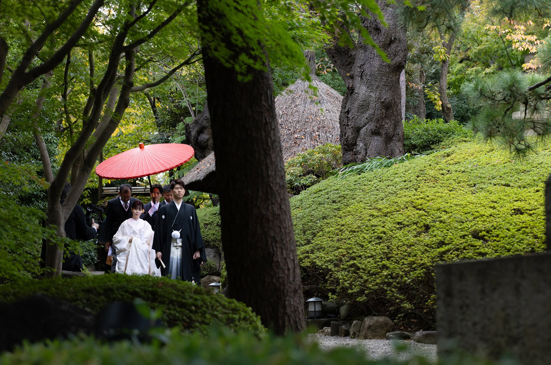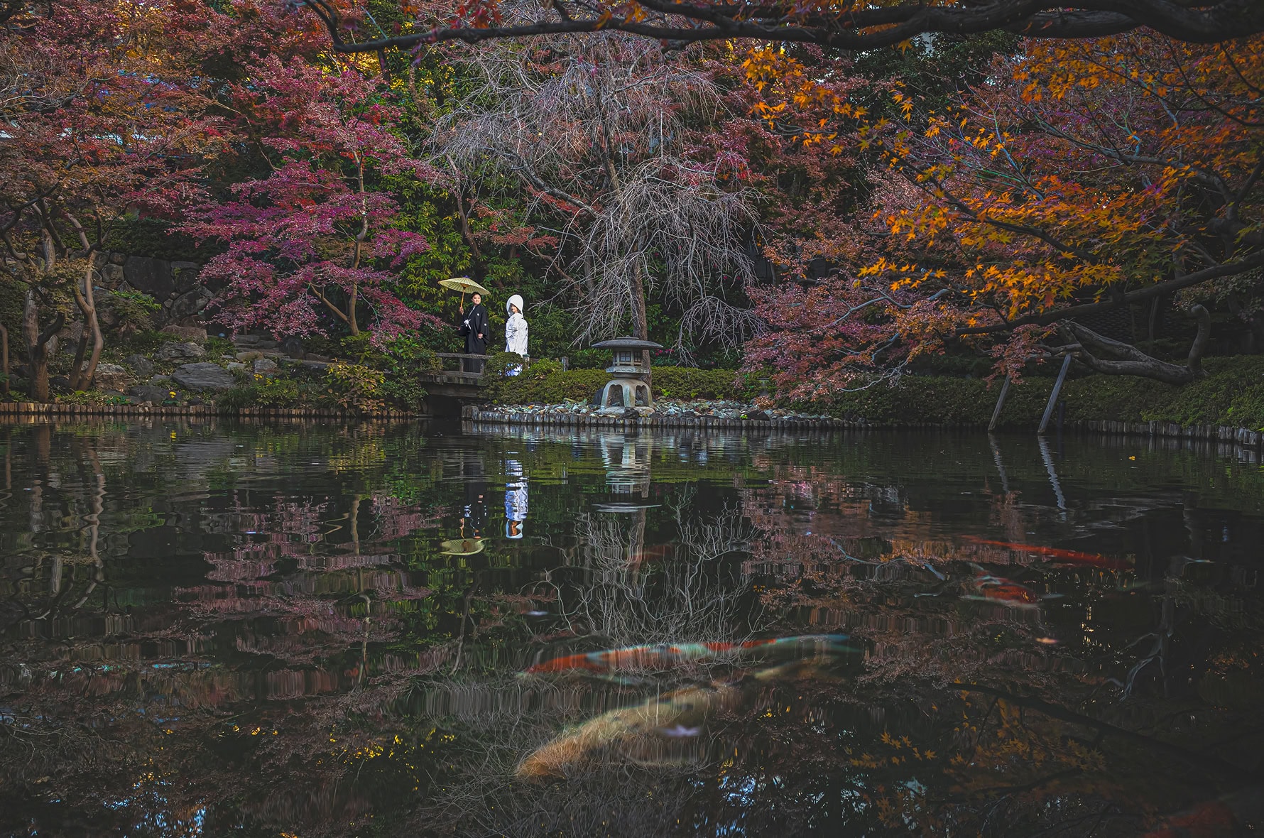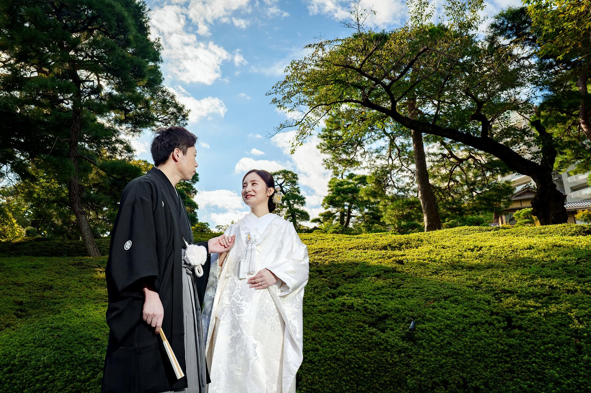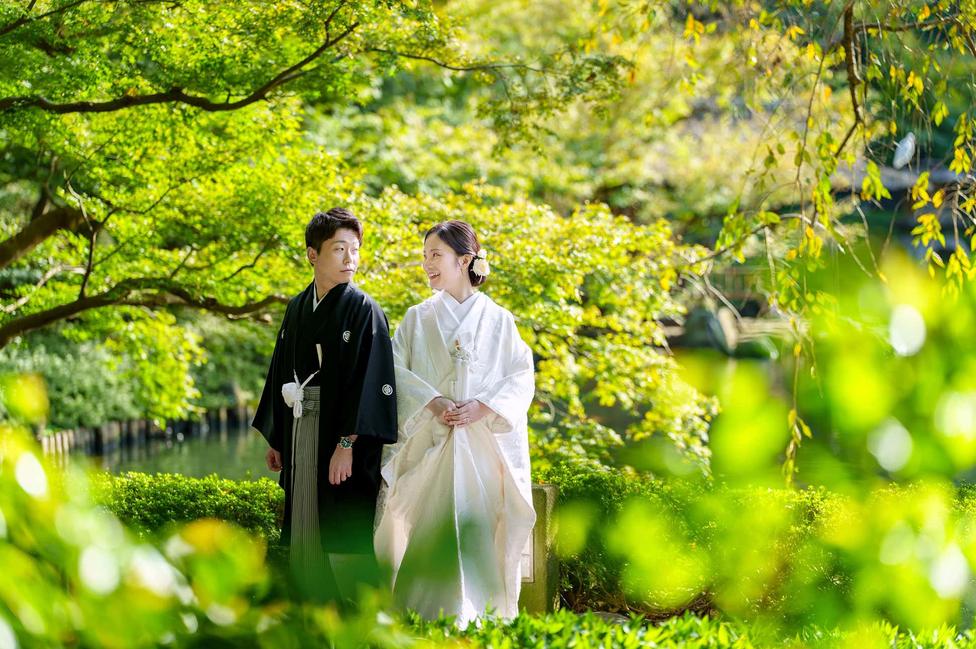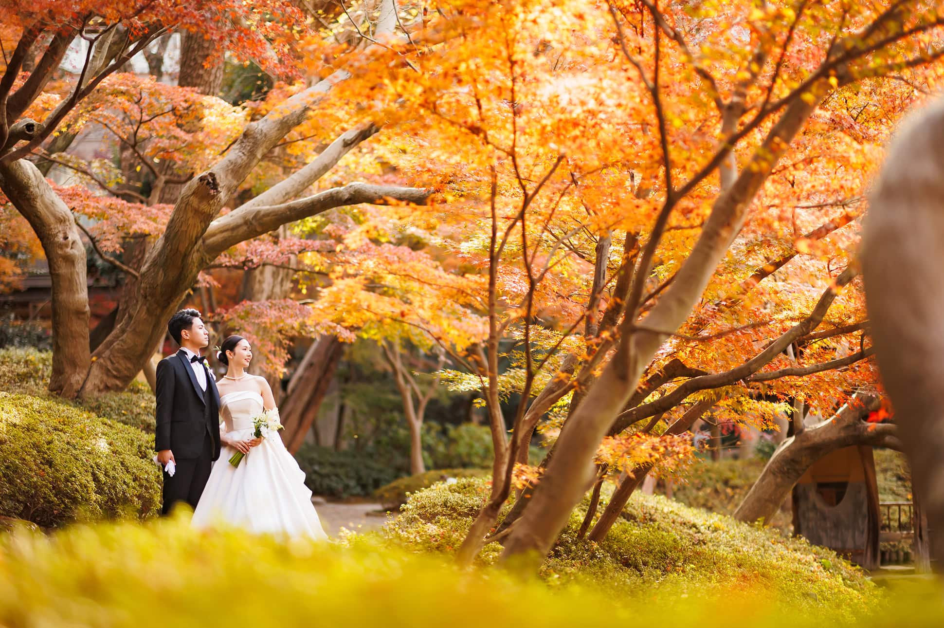 舞台は、約一万坪の敷地内に広がる広大な日本庭園。約400年の歴史を持つ庭園は、四季折々の美しい表情を見せます。庭園内の様々なスポットだけでなく、チャペルや神殿など園内には数多くのロケーションが。衣裳やおふたりのイメージに合わせて、バリエーション豊かな写真を残していただくことができます。