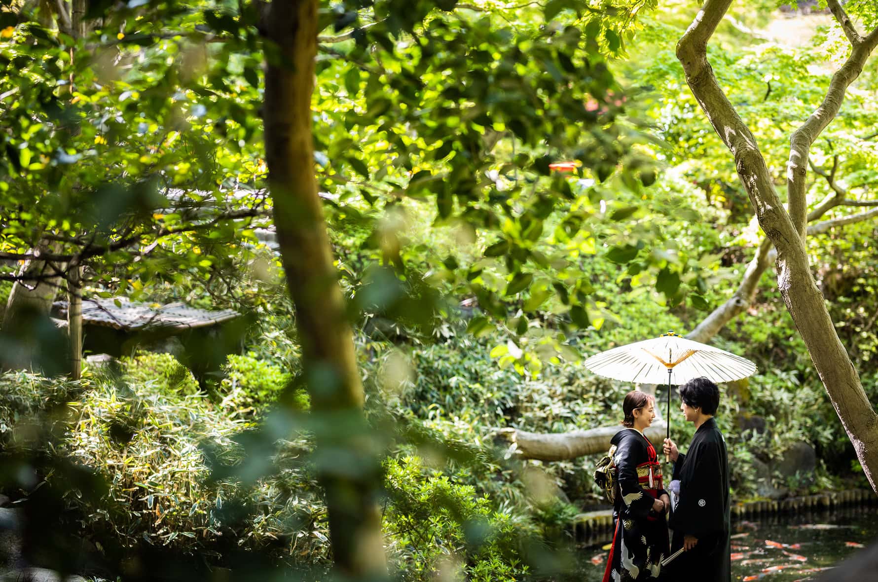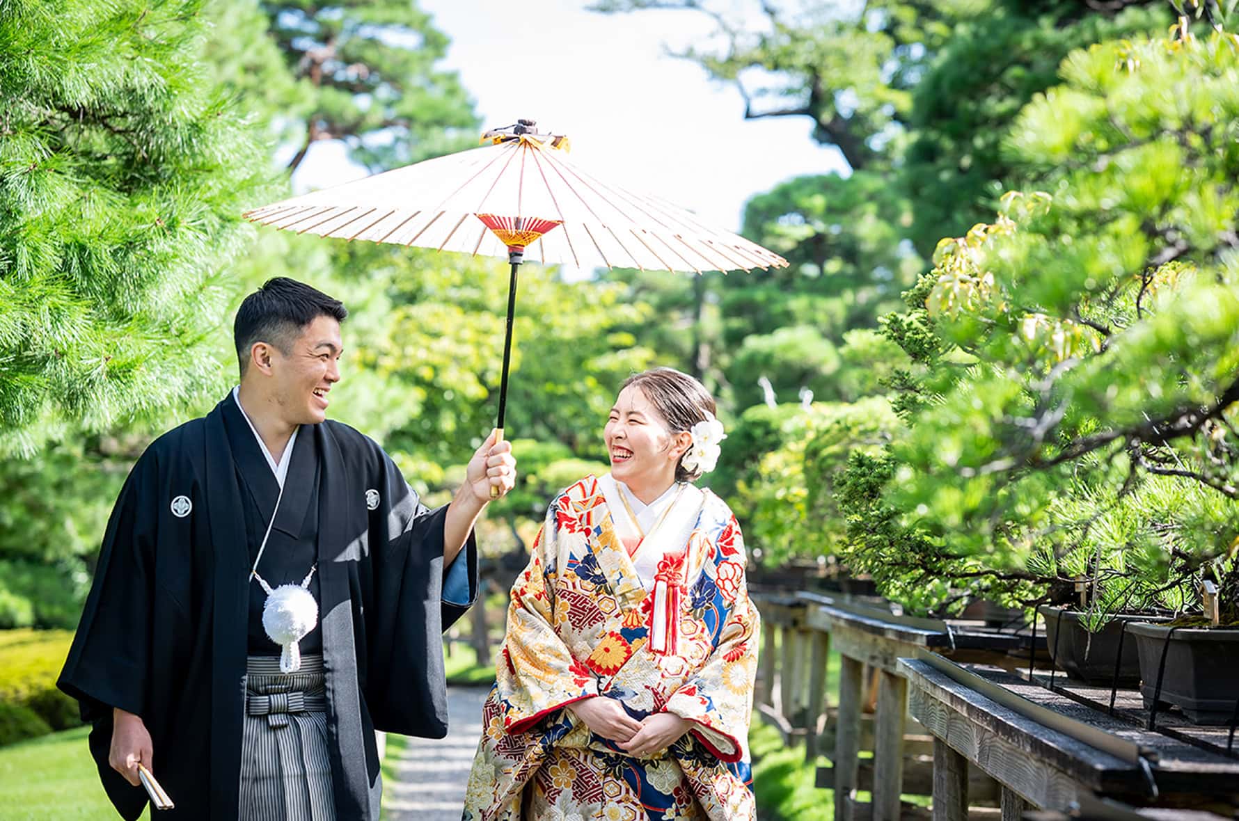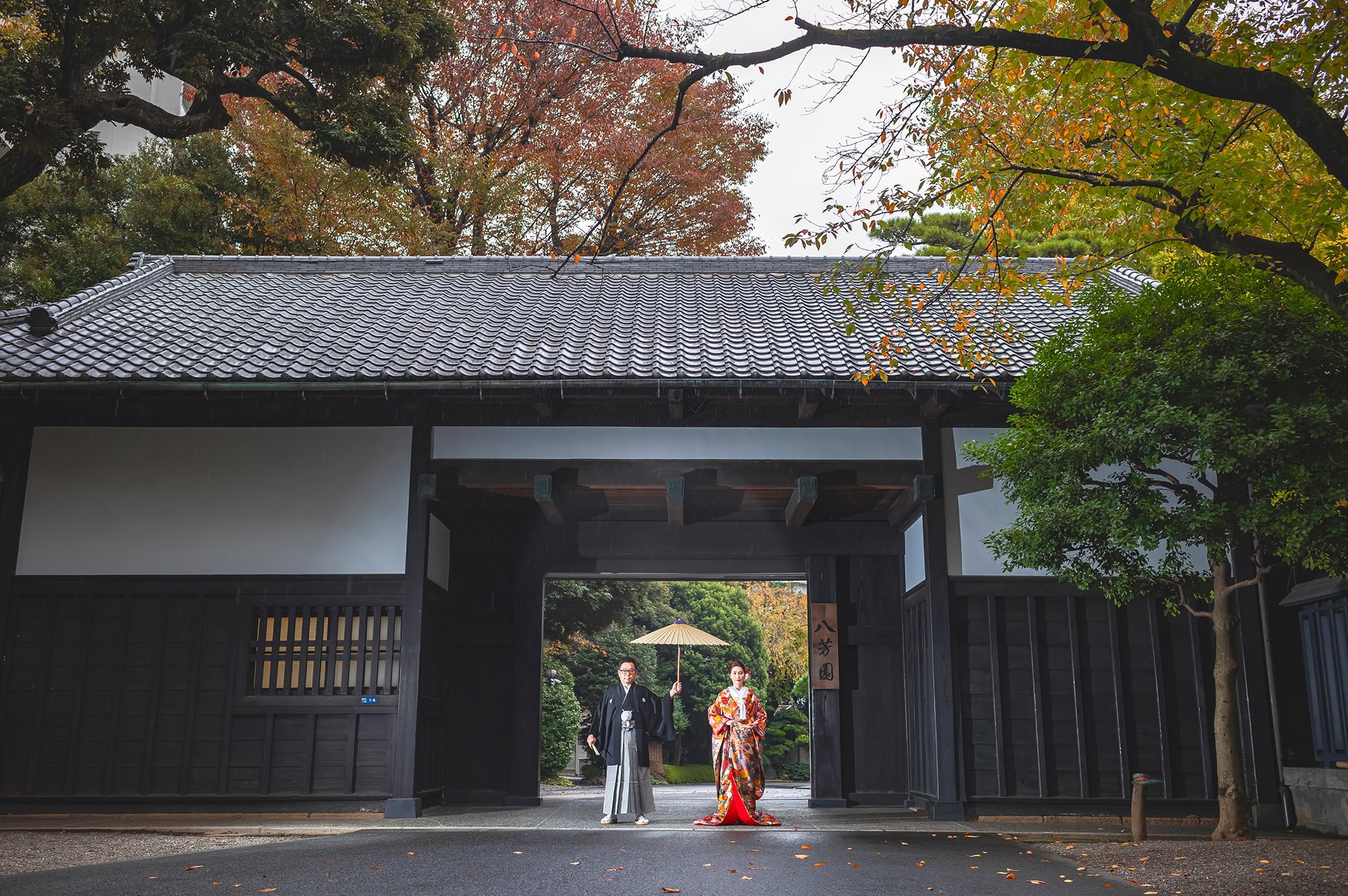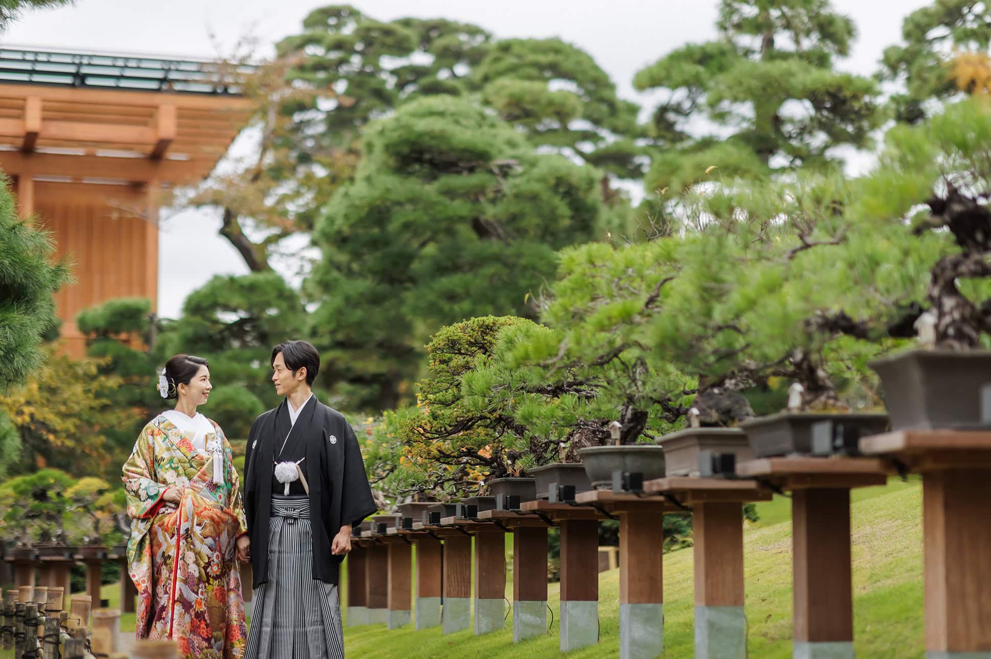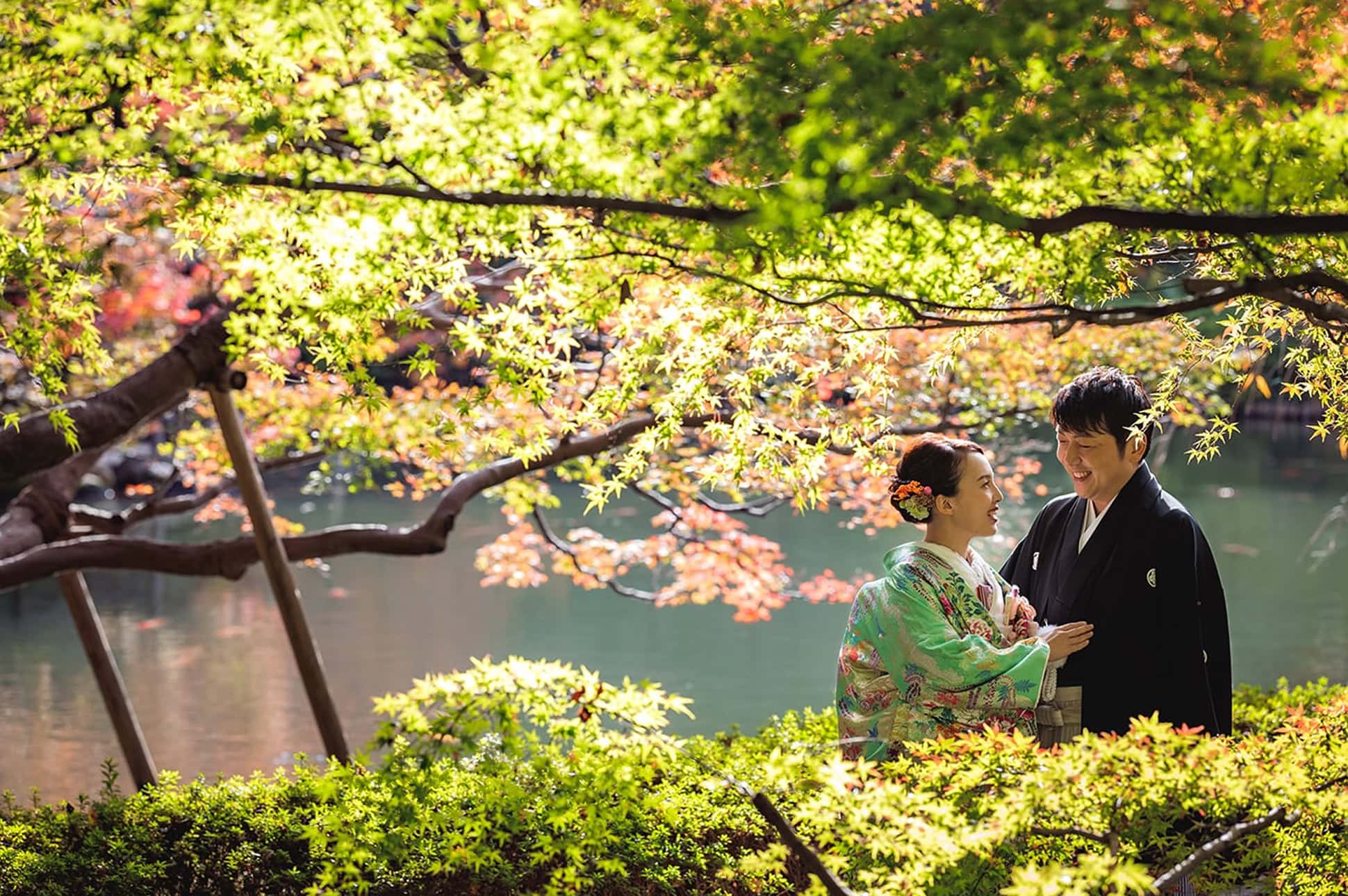 舞台は、約一万坪の敷地内に広がる広大な日本庭園。約400年の歴史を持つ庭園は、四季折々の美しい表情を見せます。庭園内の様々なスポットだけでなく、チャペルや神殿など園内には数多くのロケーションが。衣裳やおふたりのイメージに合わせて、バリエーション豊かな写真を残していただくことができます。